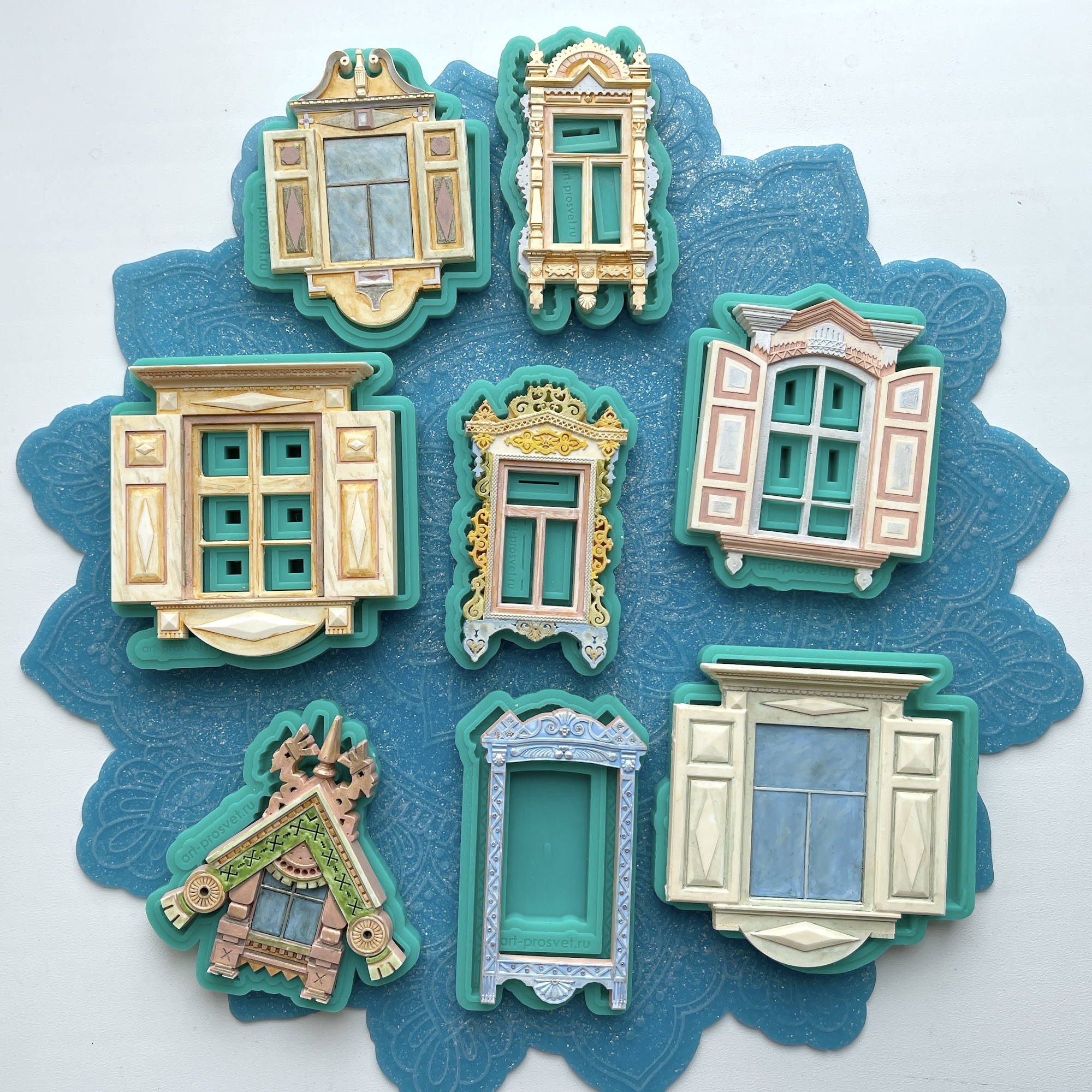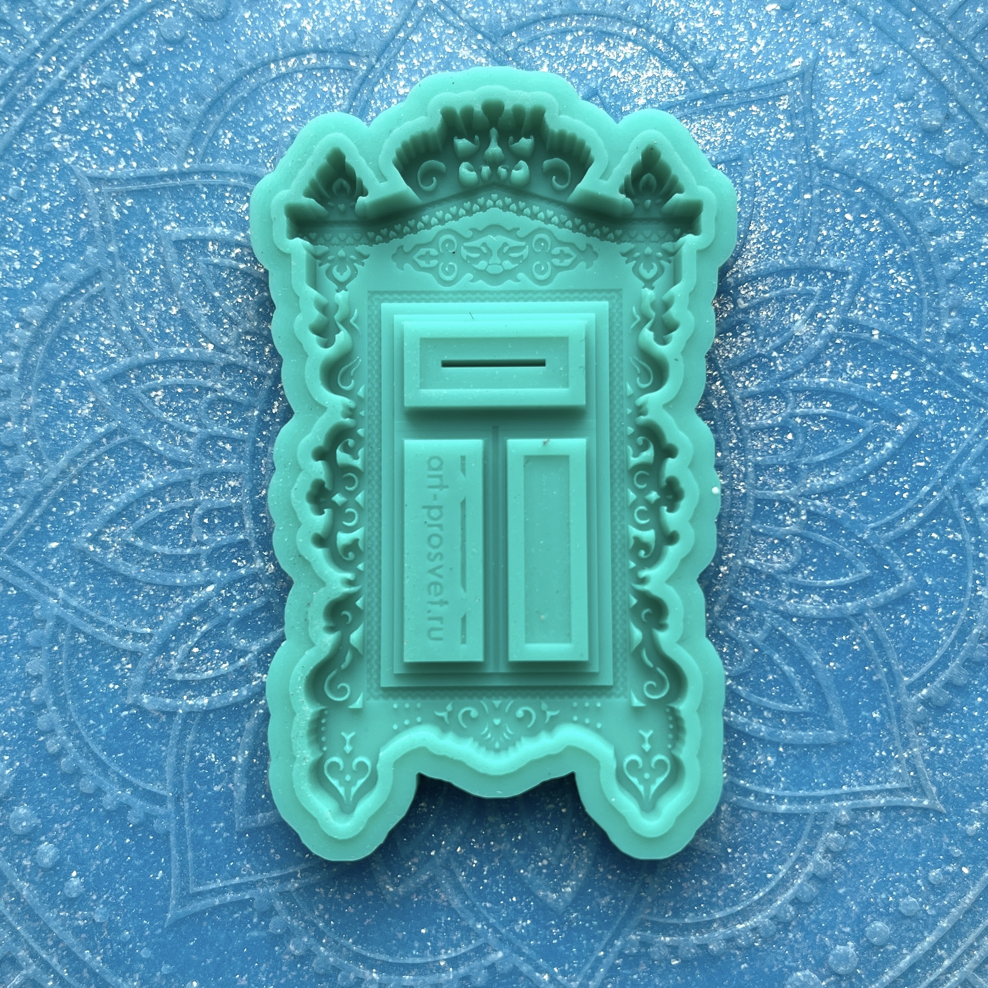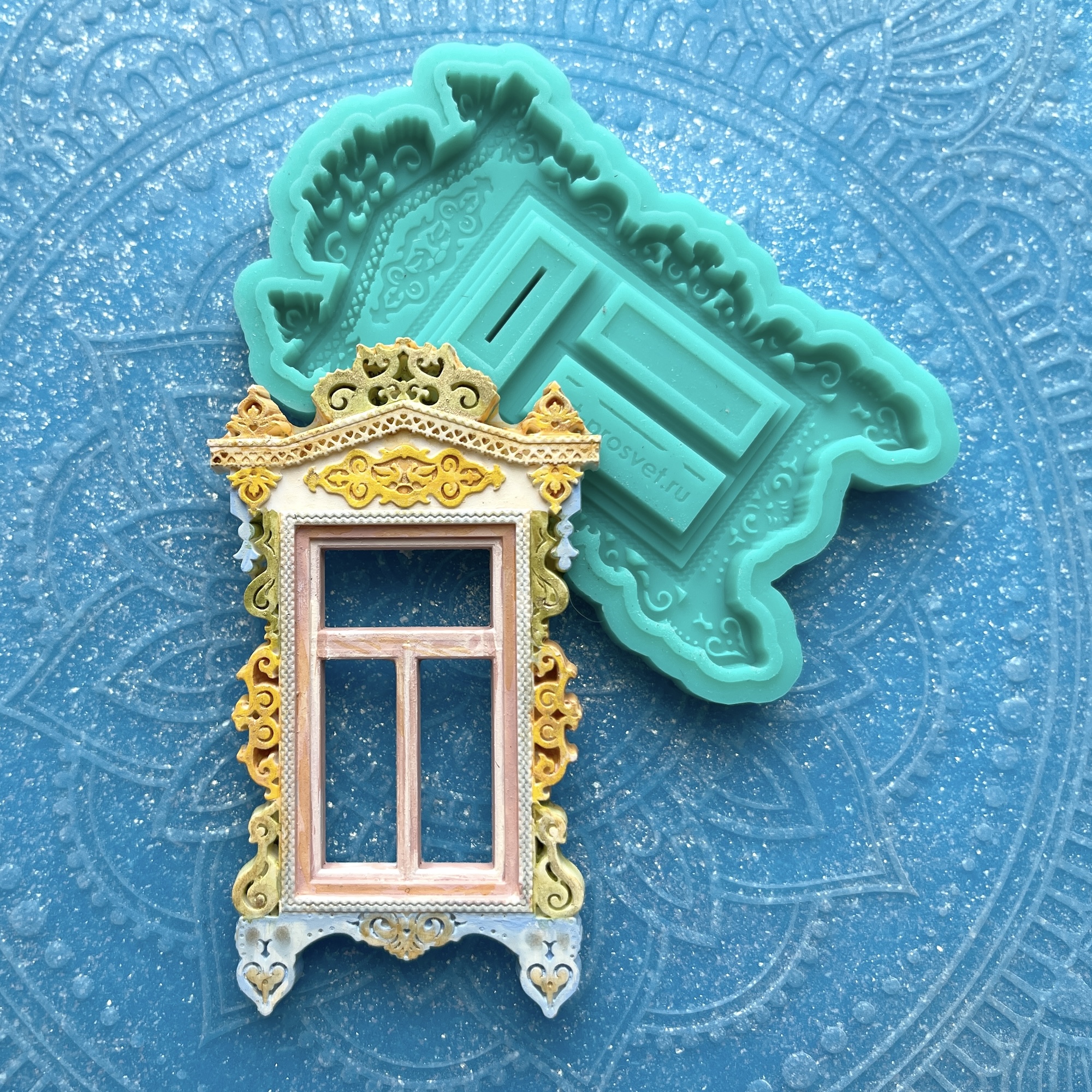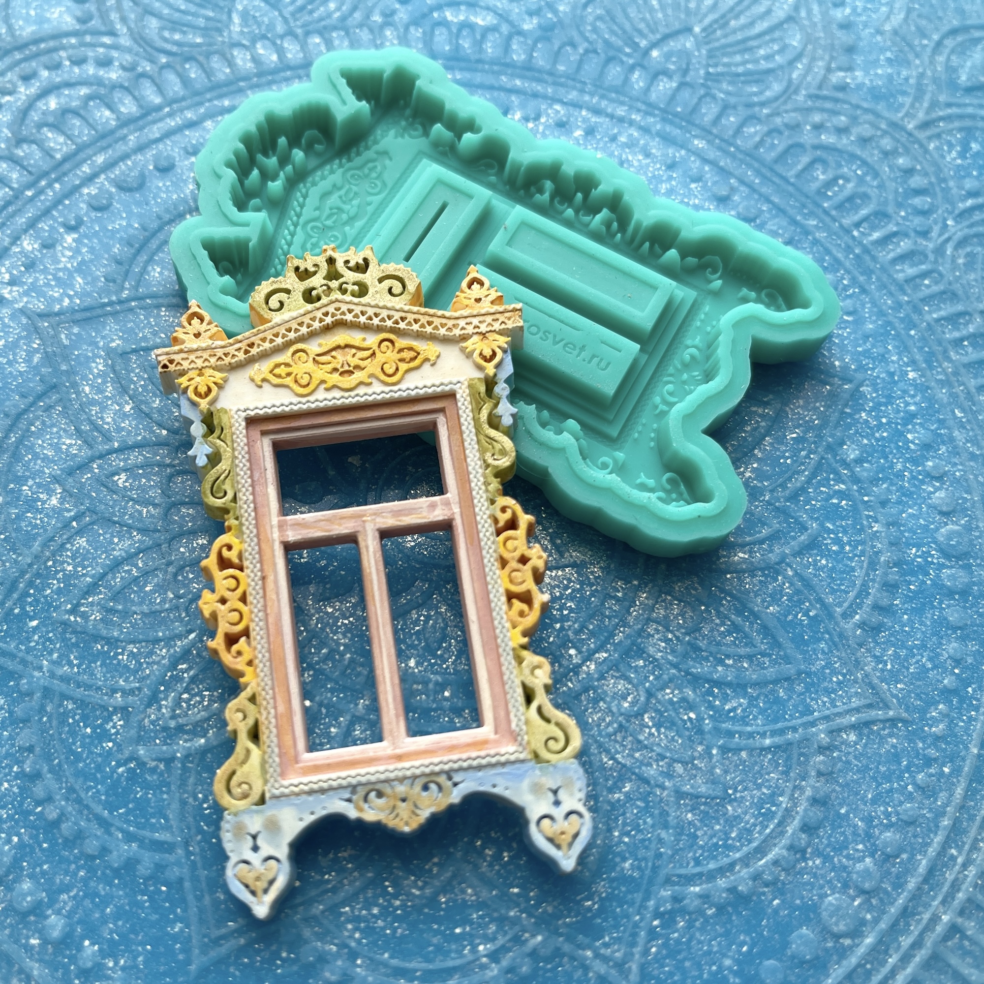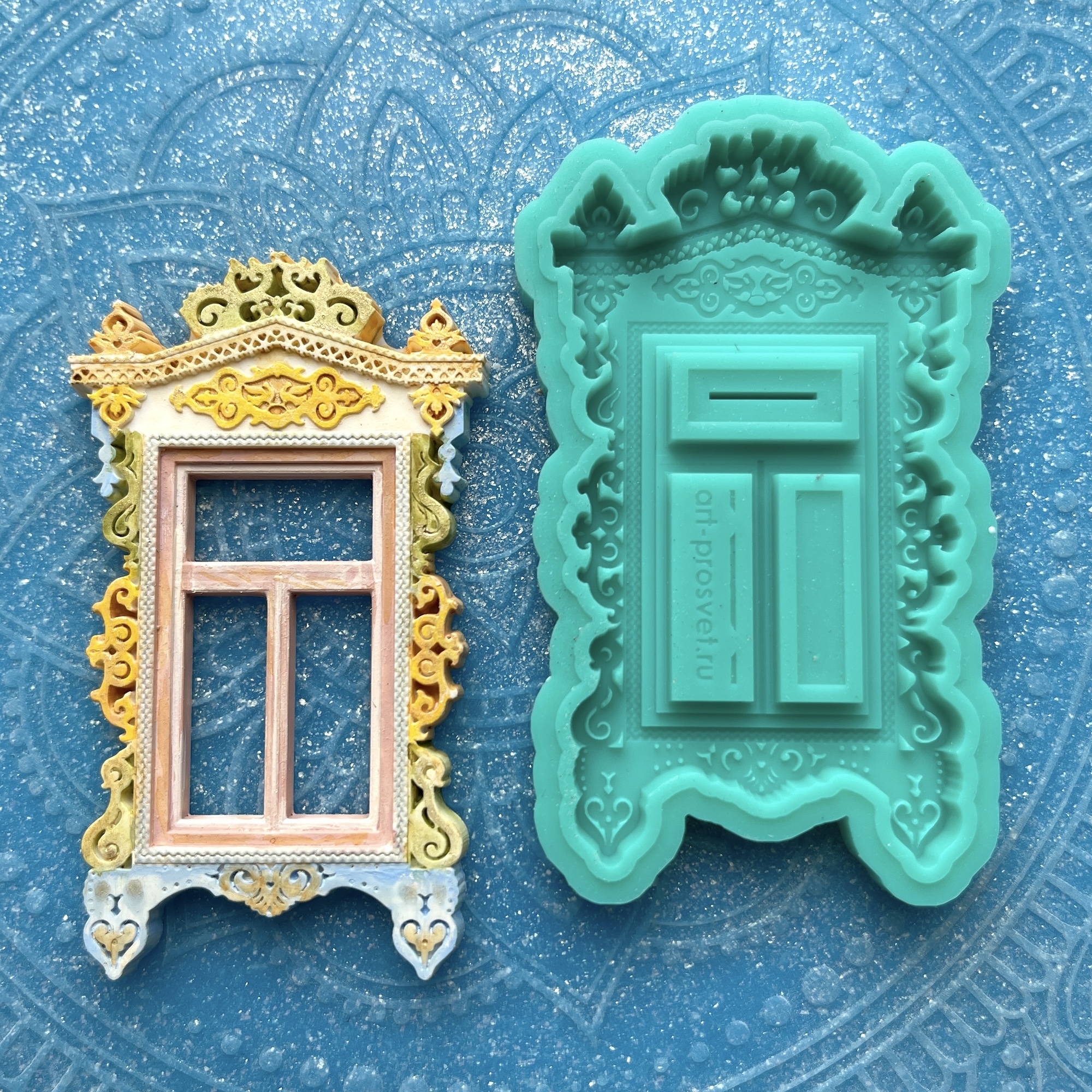 Фигурка, представленная на фото рядом с силиконовой формой, является примером окрашивания и декорирования отливок, не входит в комплект.