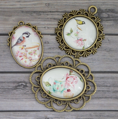 Набор металлических подвесок со стеклянными кабошонами высокого рельефа. В наборе 2 овальных рамки с размером изображения 18х26мм и 1 круглая, с диаметром 20мм