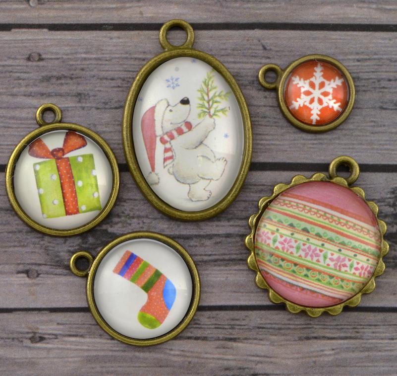 Набор металлических подвесок со стеклянными кабошонами высокого рельефа. В наборе 1 овальная рамка с размером изображения 18х26мм, 1 круглая - диаметр 20, 2 круглых - диаметр 16мм и 1 с диаметром 10мм