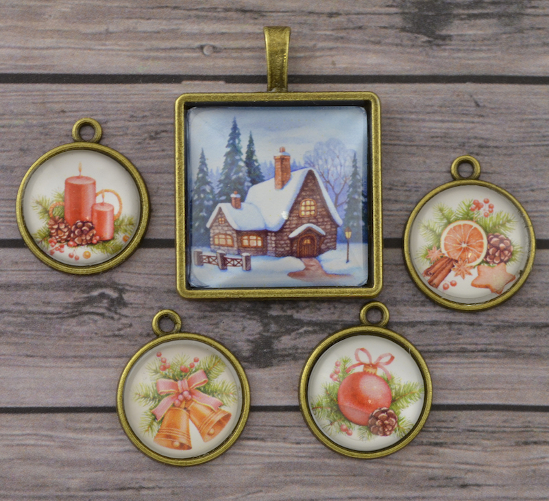Набор металлических подвесок со стеклянными кабошонами высокого рельефа. В наборе 1 квадратная рамка с размером изображения 25х25мм и 4 круглых, с диаметром 16мм