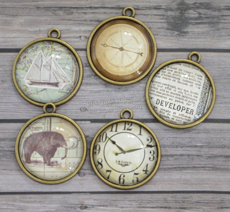 Набор металлических подвесок со стеклянными кабошонами высокого рельефа. В наборе 5 круглых рамок с диаметром изображений 20мм