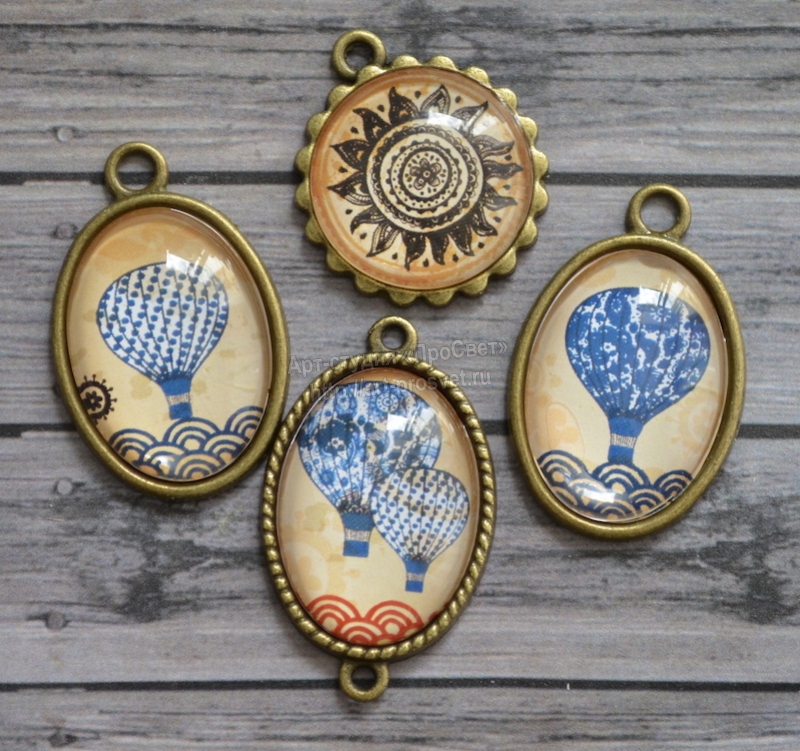 Набор металлических подвесок со стеклянными кабошонами высокого рельефа. В наборе 3 овальных рамки с размером изображения 18х26мм и 1 круглая, с диаметром 20мм