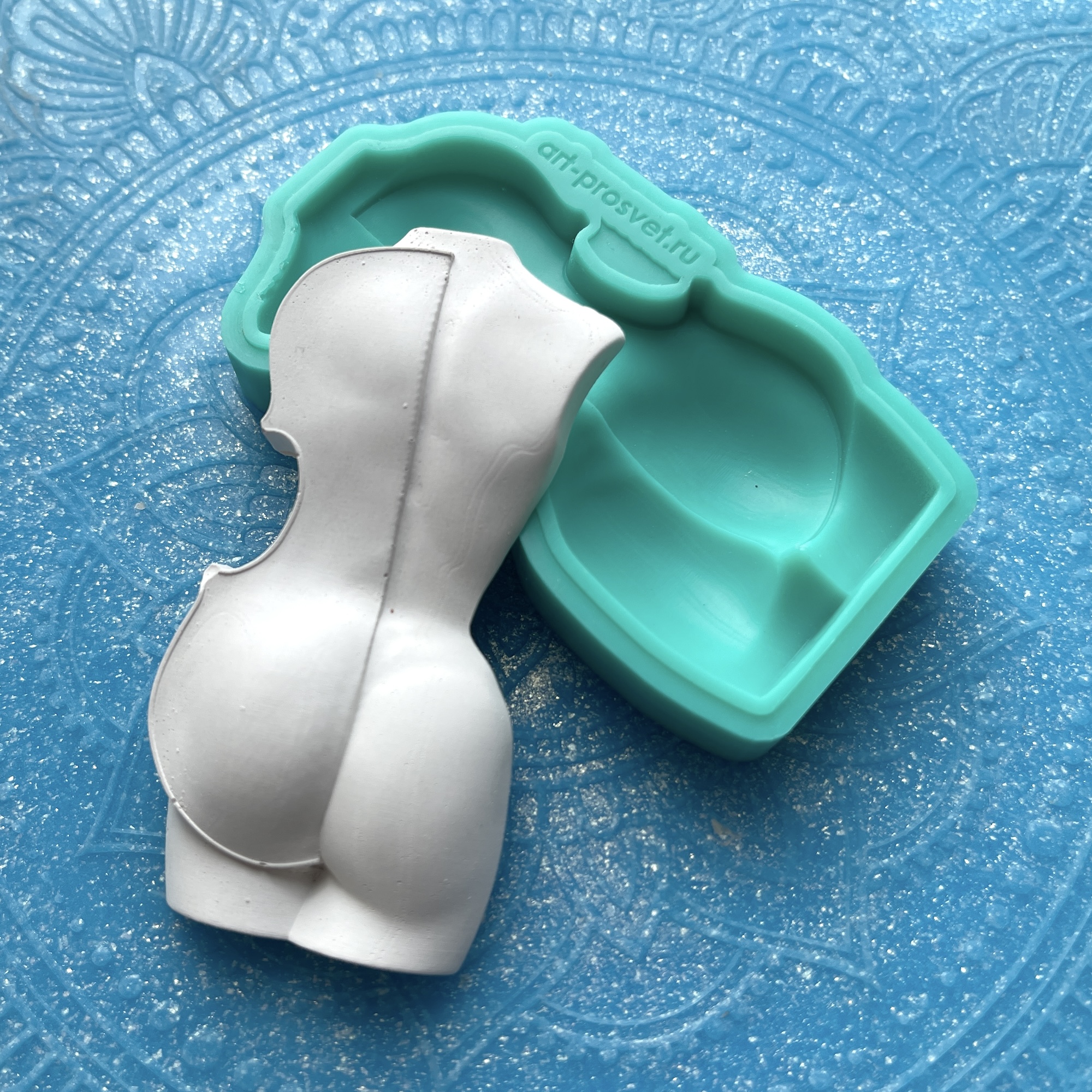 Фигурка, представленная на фото рядом с силиконовой формой, является примером окрашивания и декорирования отливок, не входит в комплект.
