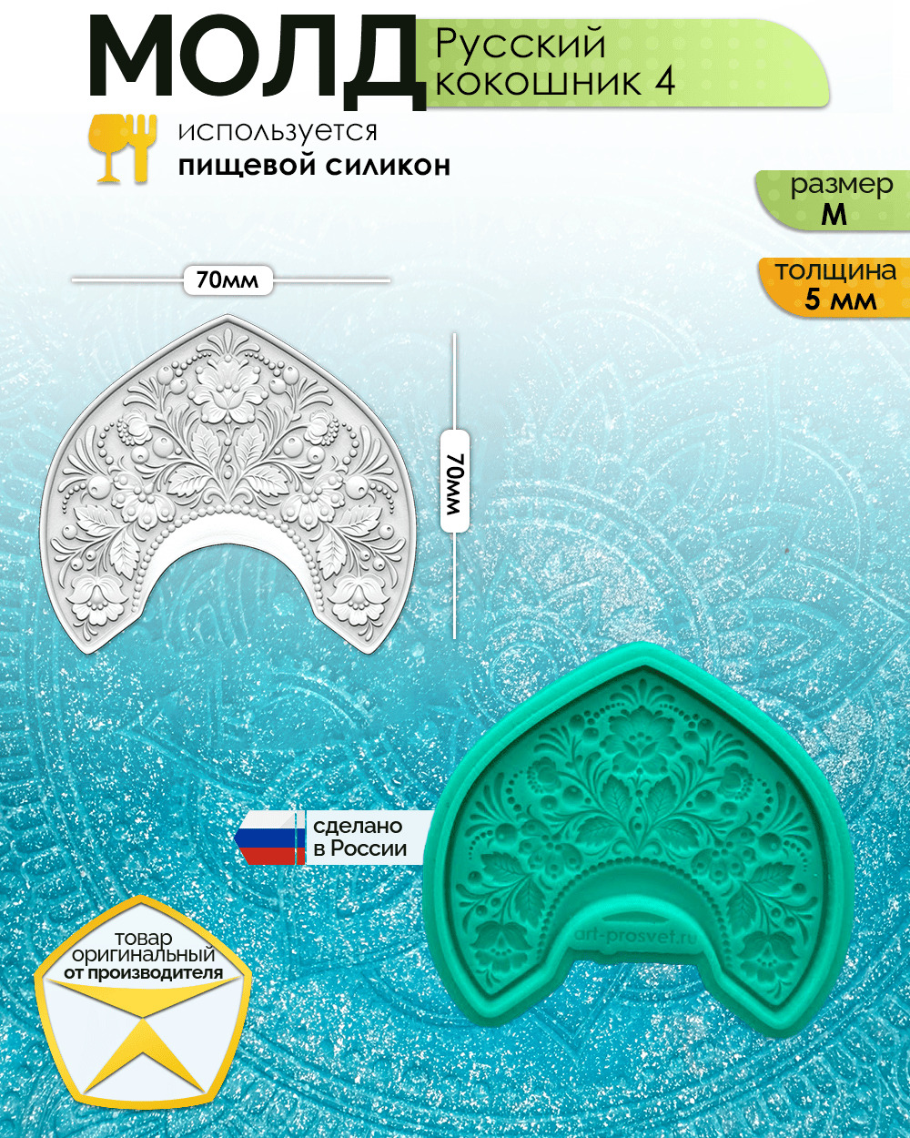 - Идеальная детализация. Платиновый силикон ювелирно точно передаёт изящную форму этого варианта кокошника и тончайшие элементы традиционного орнамента.
