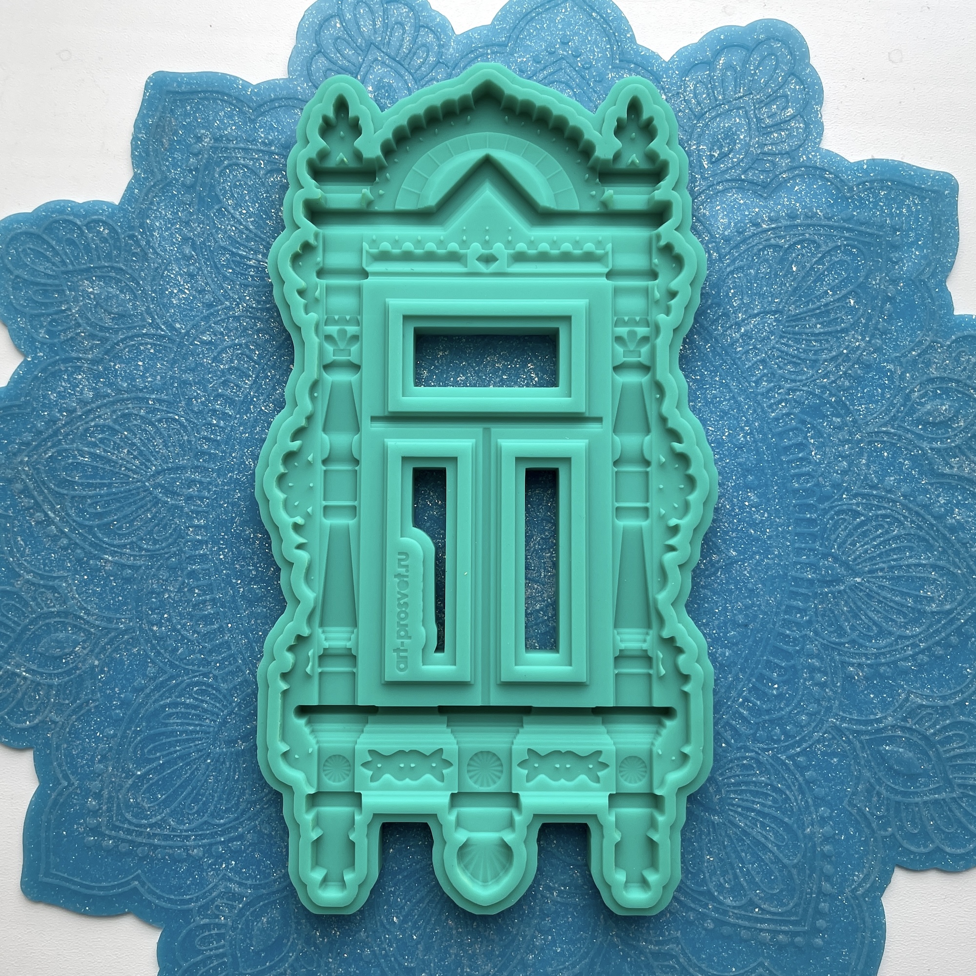 Фигурка, представленная на фото рядом с силиконовой формой, является примером окрашивания и декорирования отливок, не входит в комплект.