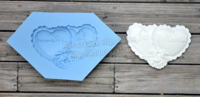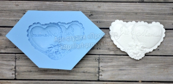 Силиконовая форма для изготовления фигурки в виде двух кружевных сердечек с голубками с надписью "Just Married". Размер получаемой фигурки 3,5х5см.